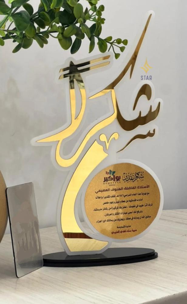 درع شكر وتقدير مميز اهداء للمعلمات والمعلمين تصم حسب الطلبتفاصيل المنتج• درع شكر وتقدير المعلم• مصنوع من الاكريلك• تصميم وطباعة العبارة والاسماء حسب الطلب• المقاس 17 سم* 25 سمخدمة توصيل وشحن لكافة المدن